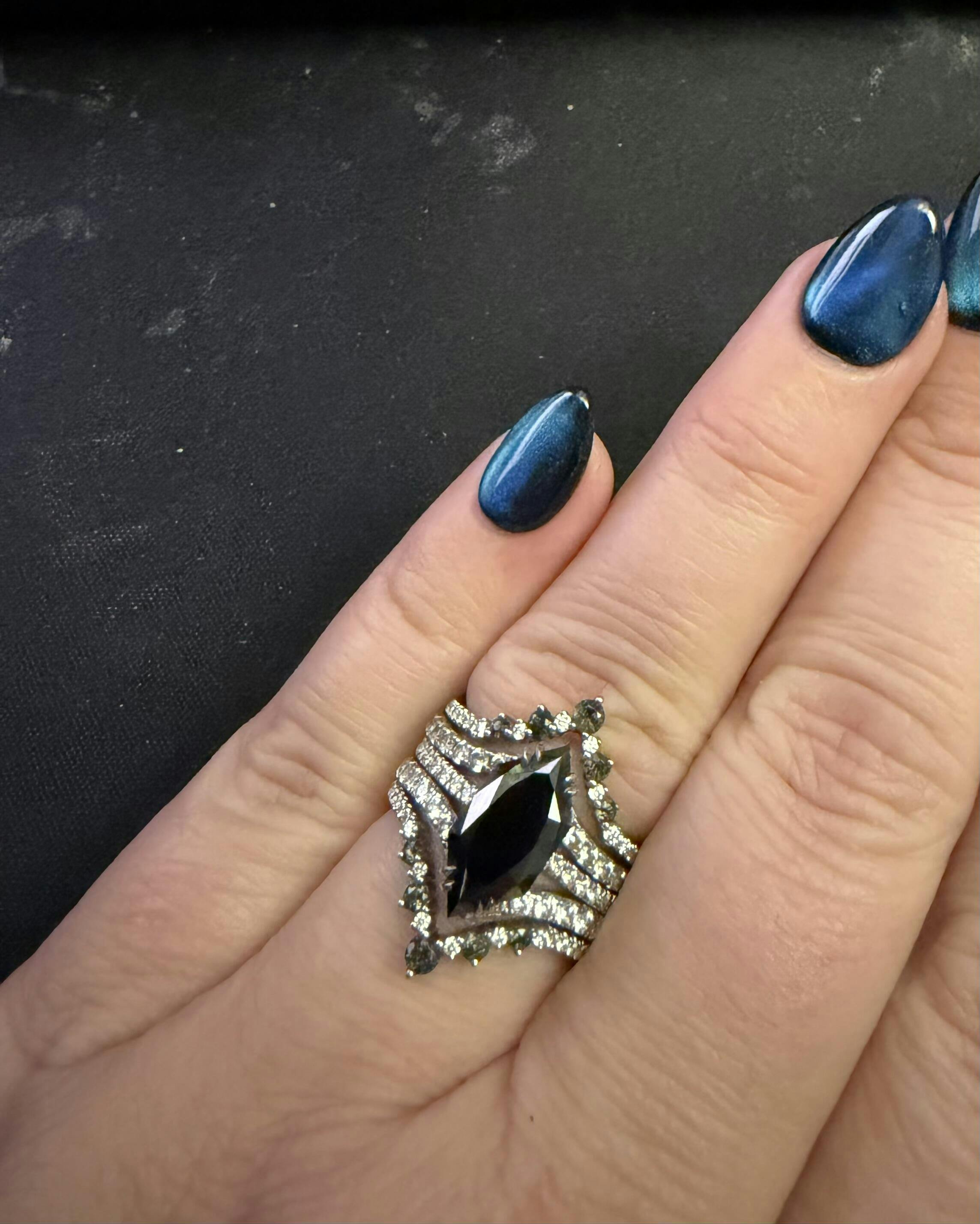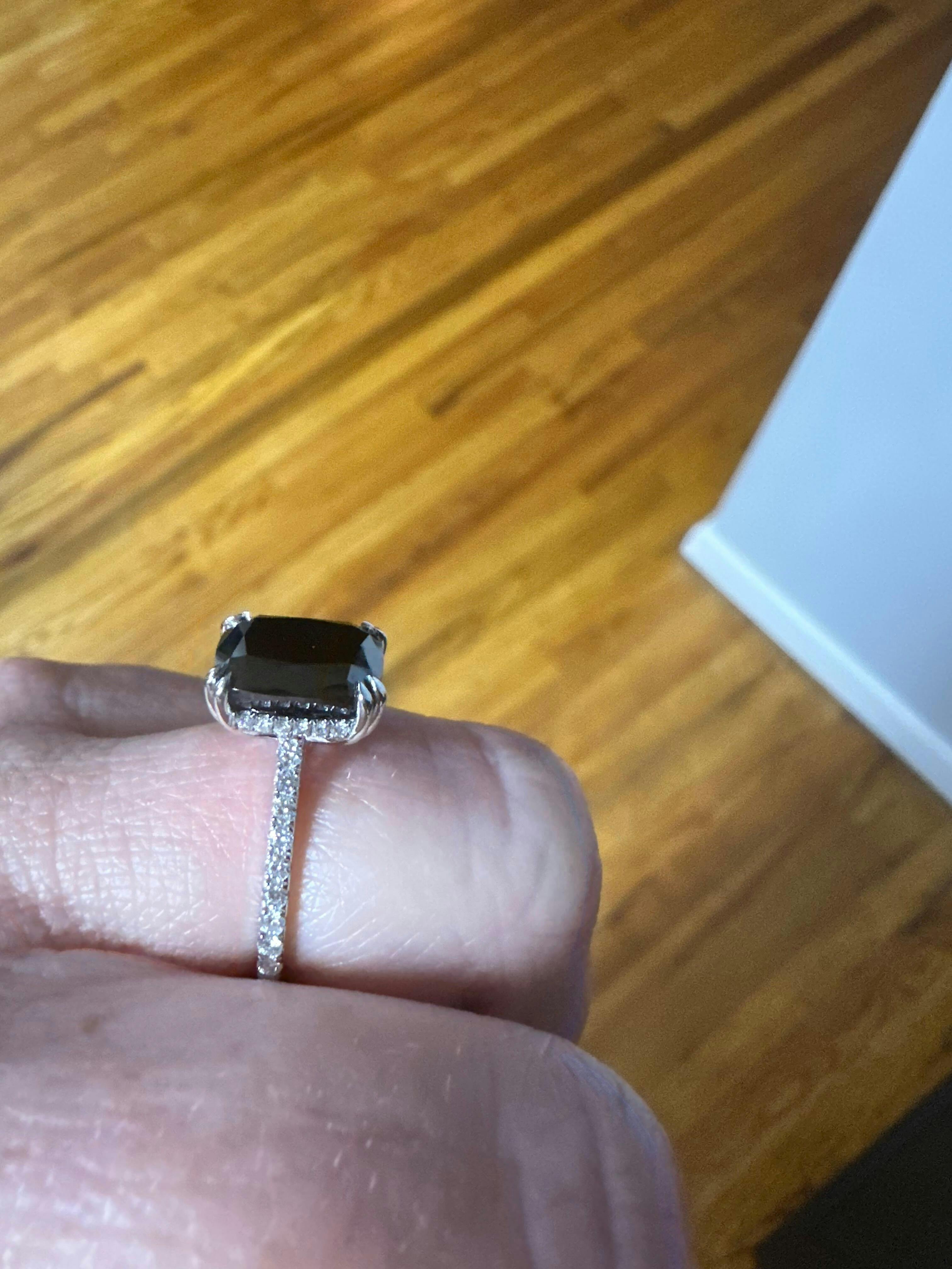 This ring is perfection, I am obsessed with it. It’s everything I wanted in a black engagement ring. The center stone is larger than I expected. Jay emailed and kept me updated, wonderful experience I’ll definitely be ordering more jewelry.