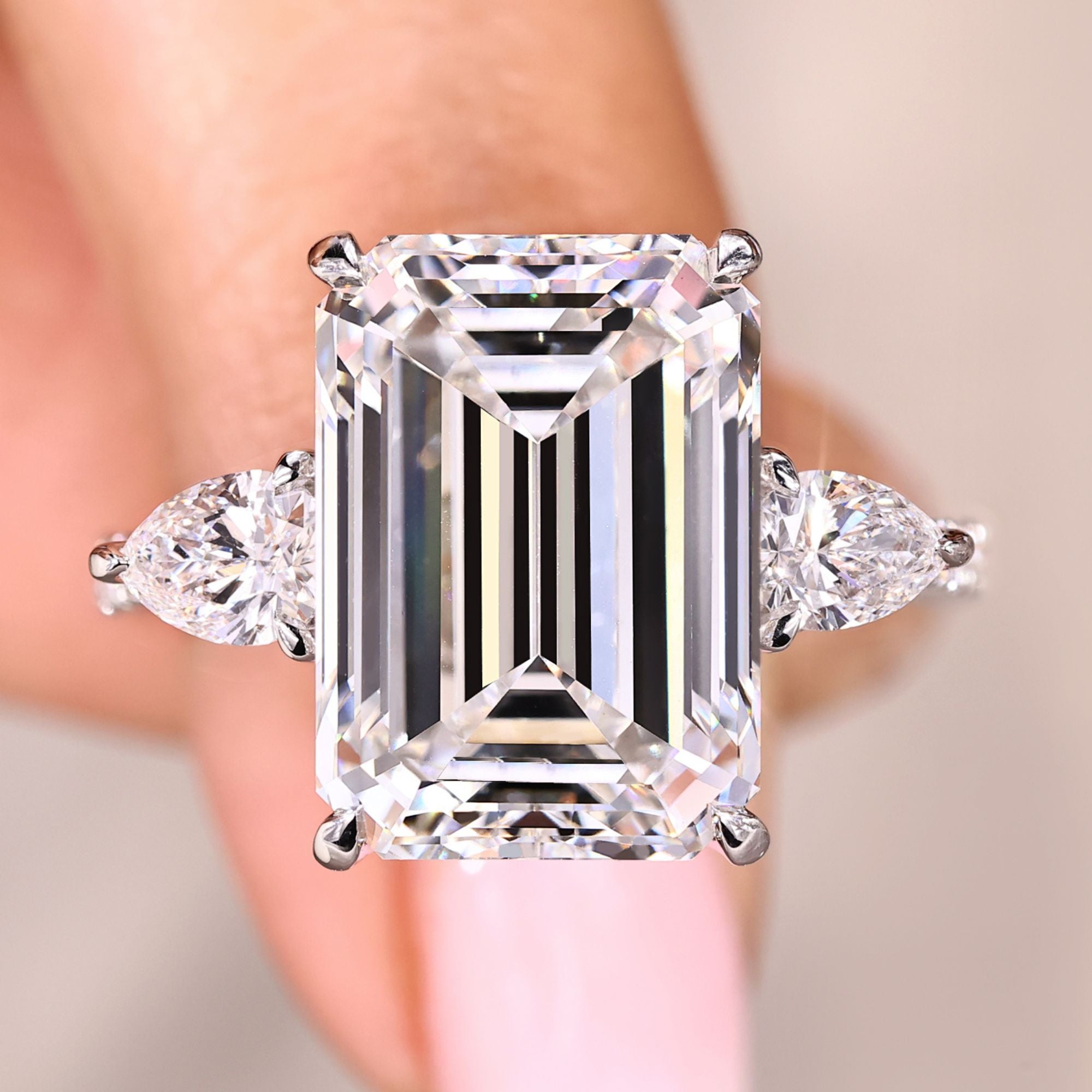IGI certified stones lead the way in this 10 Carat Emerald Cut Diamond Engagement Ring, providing official proof of its high quality. The center stone is held by a four claw prong setting that keeps the diamond secure while showing off its long, clear facets. Two pear side stones sit on either side to add a wide look to the top of the ring.