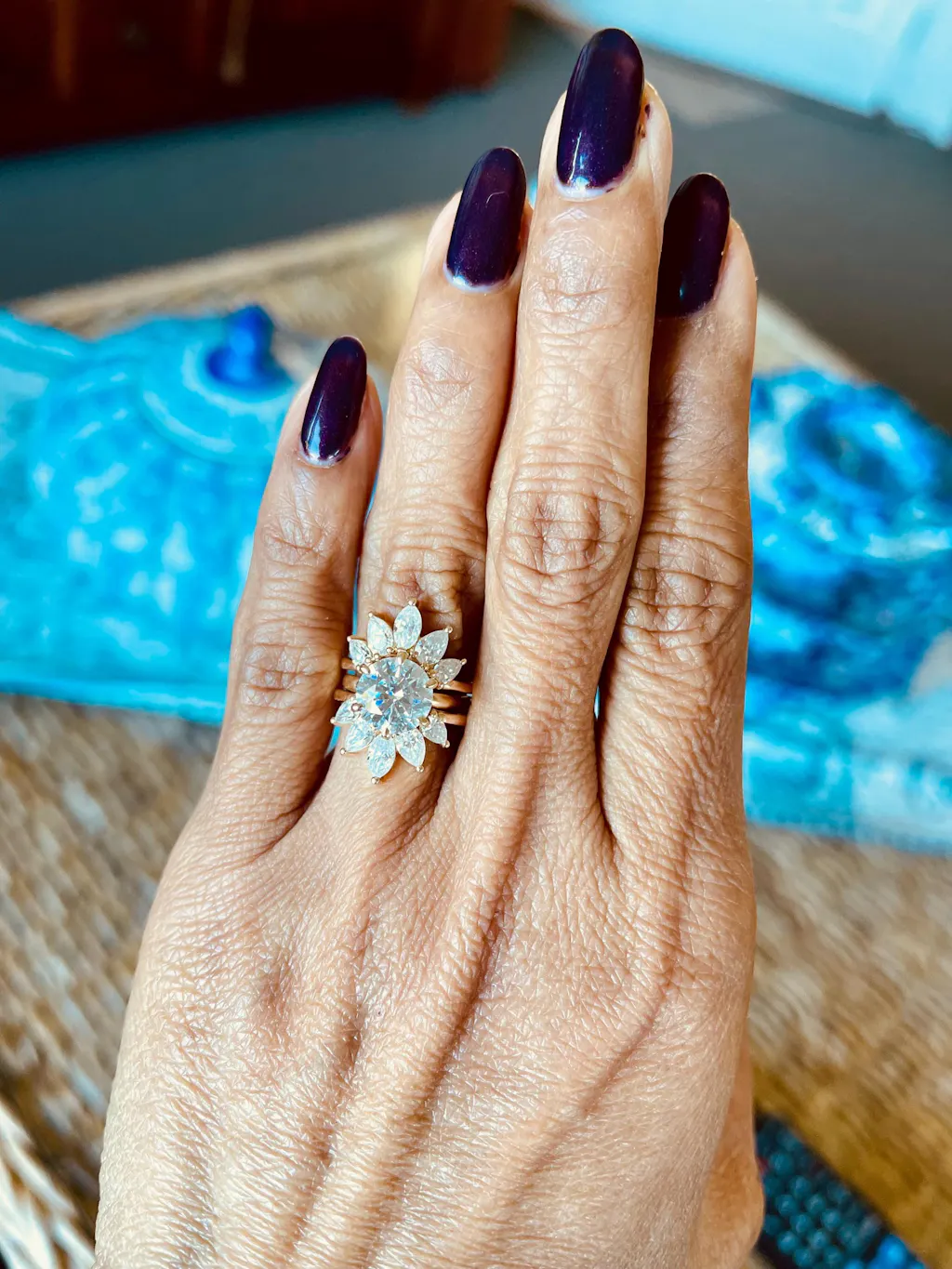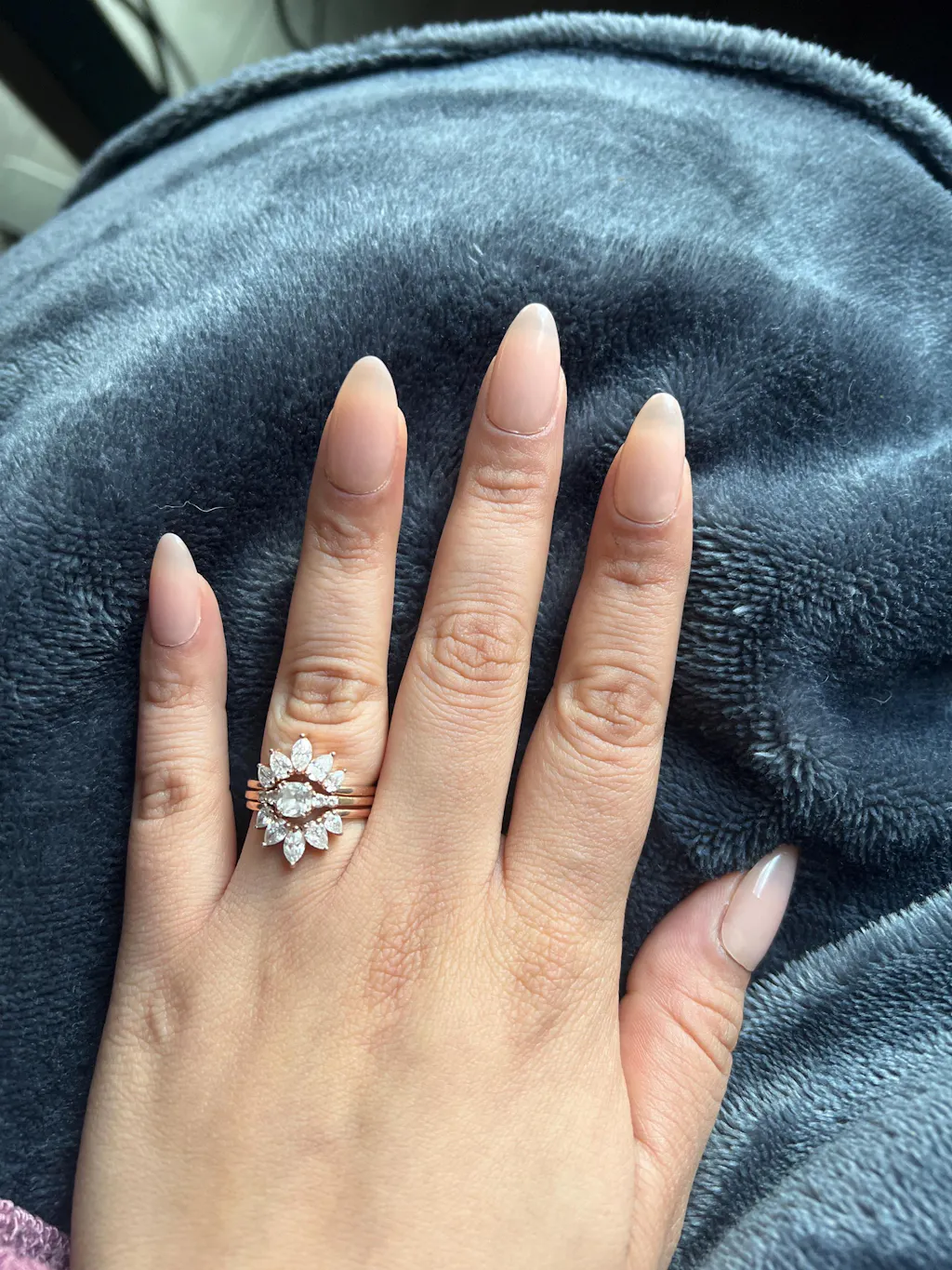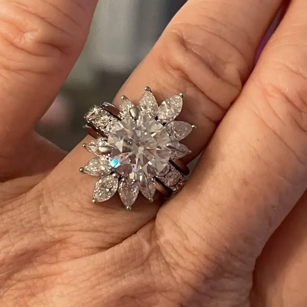 - Unique Shape: The marquise and pear cut moissanite stones create a petal-like pattern around your main ring.