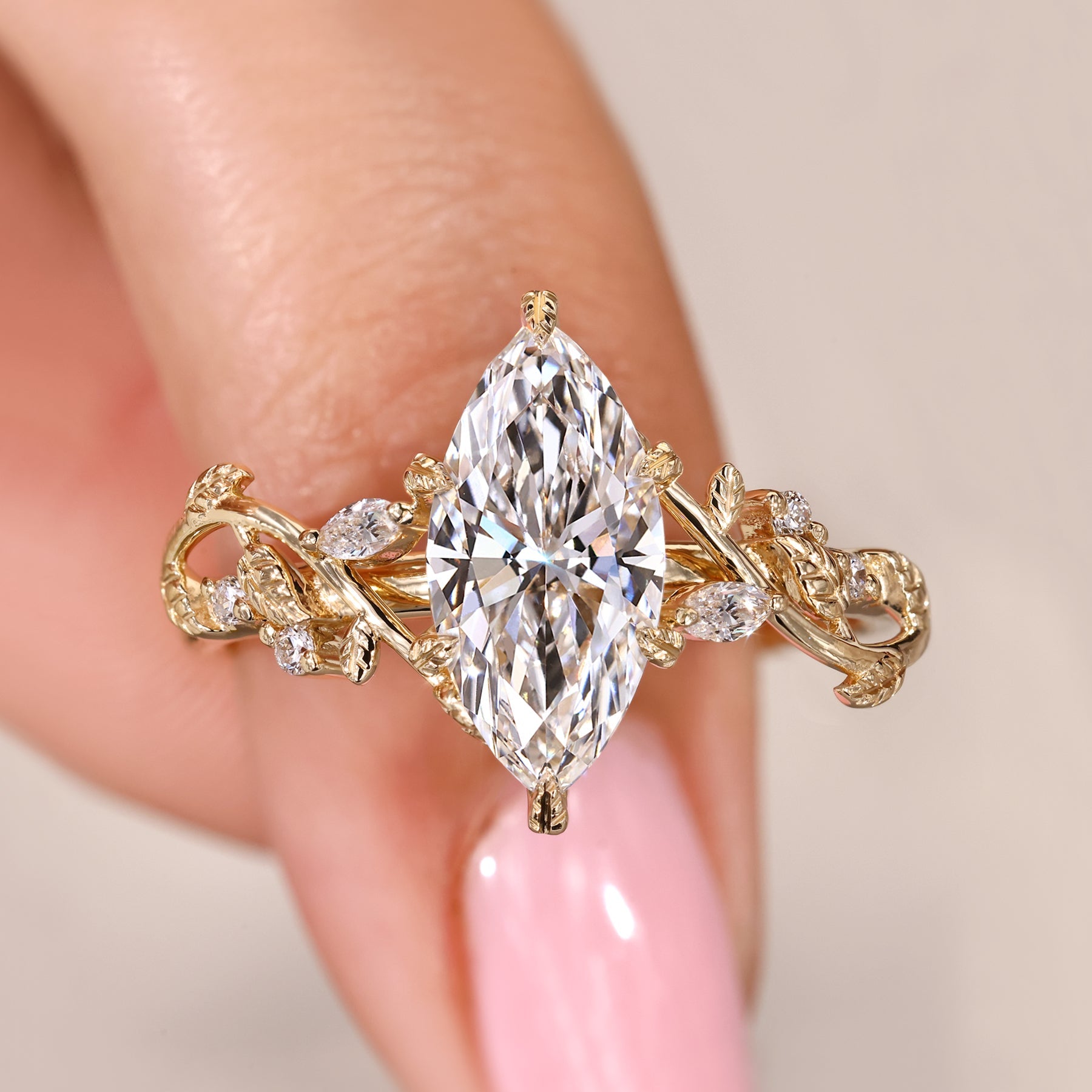Instead of plain metal, we added marquise and round side stones to create a flow across the band. This nature inspired theme continues with a leaf style prong that holds the main diamond in place. Because these small details wrap around the stones, the ring feels like a custom piece of art.