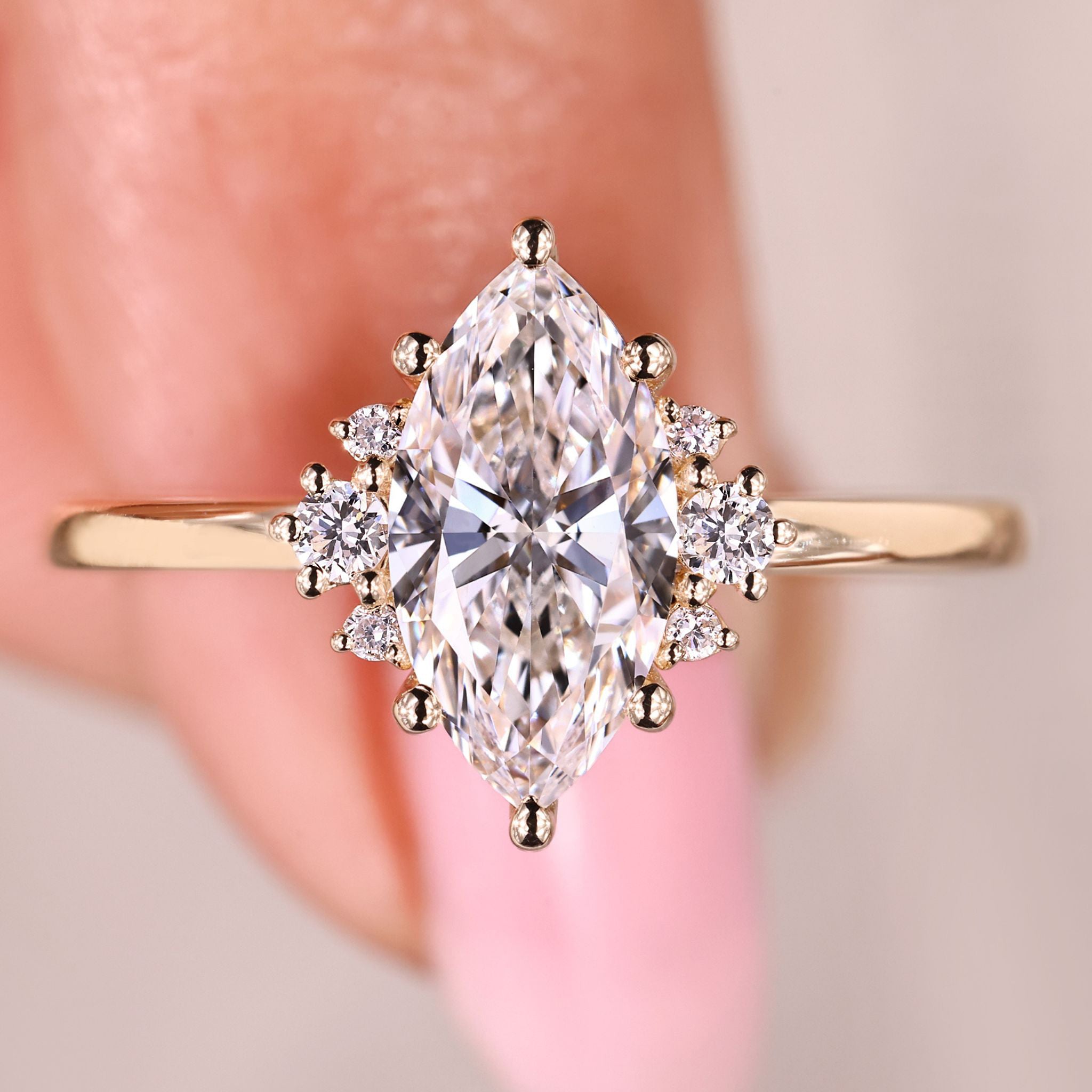 Extra Brilliance: Every round side diamond is placed to add sparkle next to the marquise center.