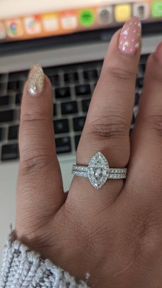 - Dazzling Halo Design: The marquise diamond with halo design enhances the central stone’s brilliance, creating a bold yet elegant look.