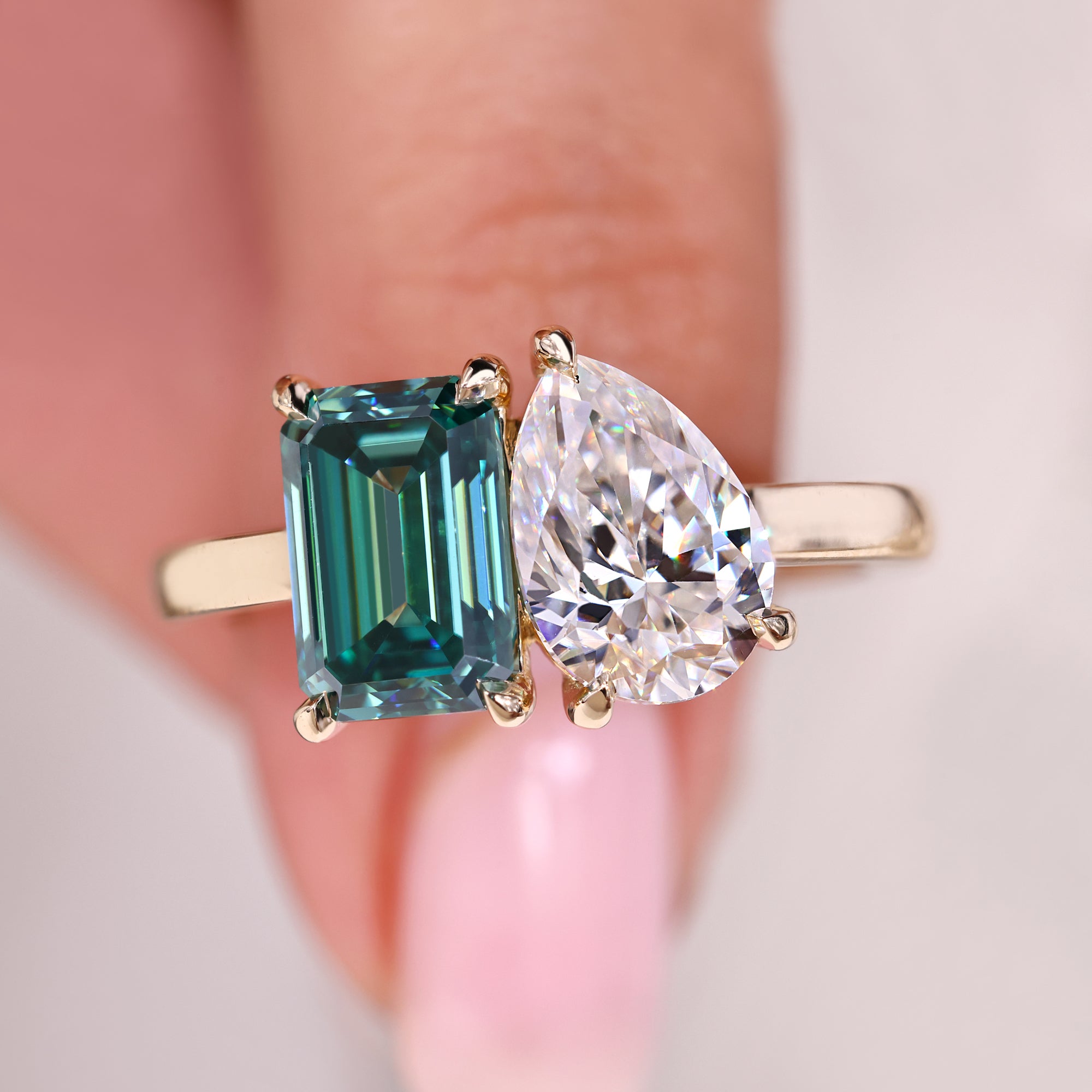 Pear and Emerald Cut Ring brings a balanced look with a modern feel. This Pear And Emerald Cut Ring pairs two bold shapes in one design. The green emerald cut engagement ring adds depth, while the pear cut engagement ring adds flow. Together, they form a toi et moi engagement ring that feels fresh and intentional.