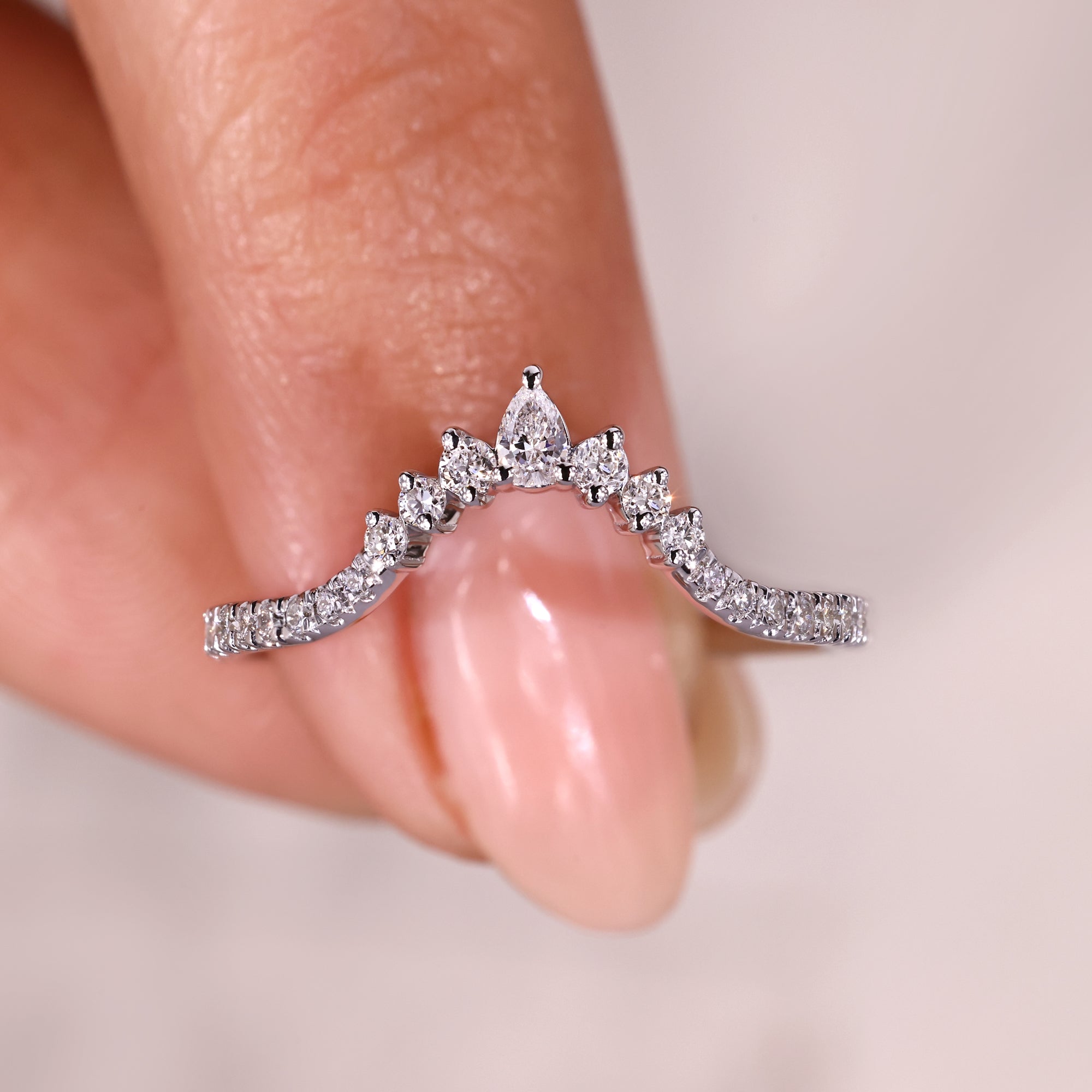 This Chevron Wedding Band uses a sharp V-shape to sit flush against your engagement ring. Each pear and round diamond is set by hand to make sure the stones stay in place during your daily routine. Because the curve is deep, it fits most solitaire styles without leaving a gap.